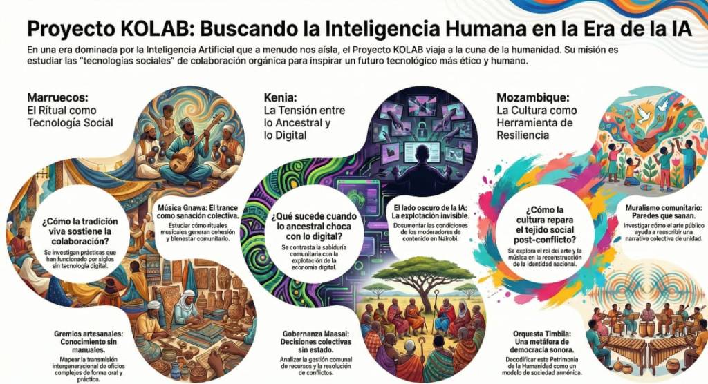 A medida que la IA amplifica la inteligencia no solo individual, sino individualizada, se vuelve imprescindible repensar la manera en que nos relacionamos, reconectar con nuestra memoria colectiva y activar la sabiduría que surge cuando pensamos y actuamos en comunidad. Kolab propone volver la mirada hacia las prácticas culturales que han permitido a los grupos humanos colaborar, cuidarse y prosperar, incluso en contextos de cambio profundo.